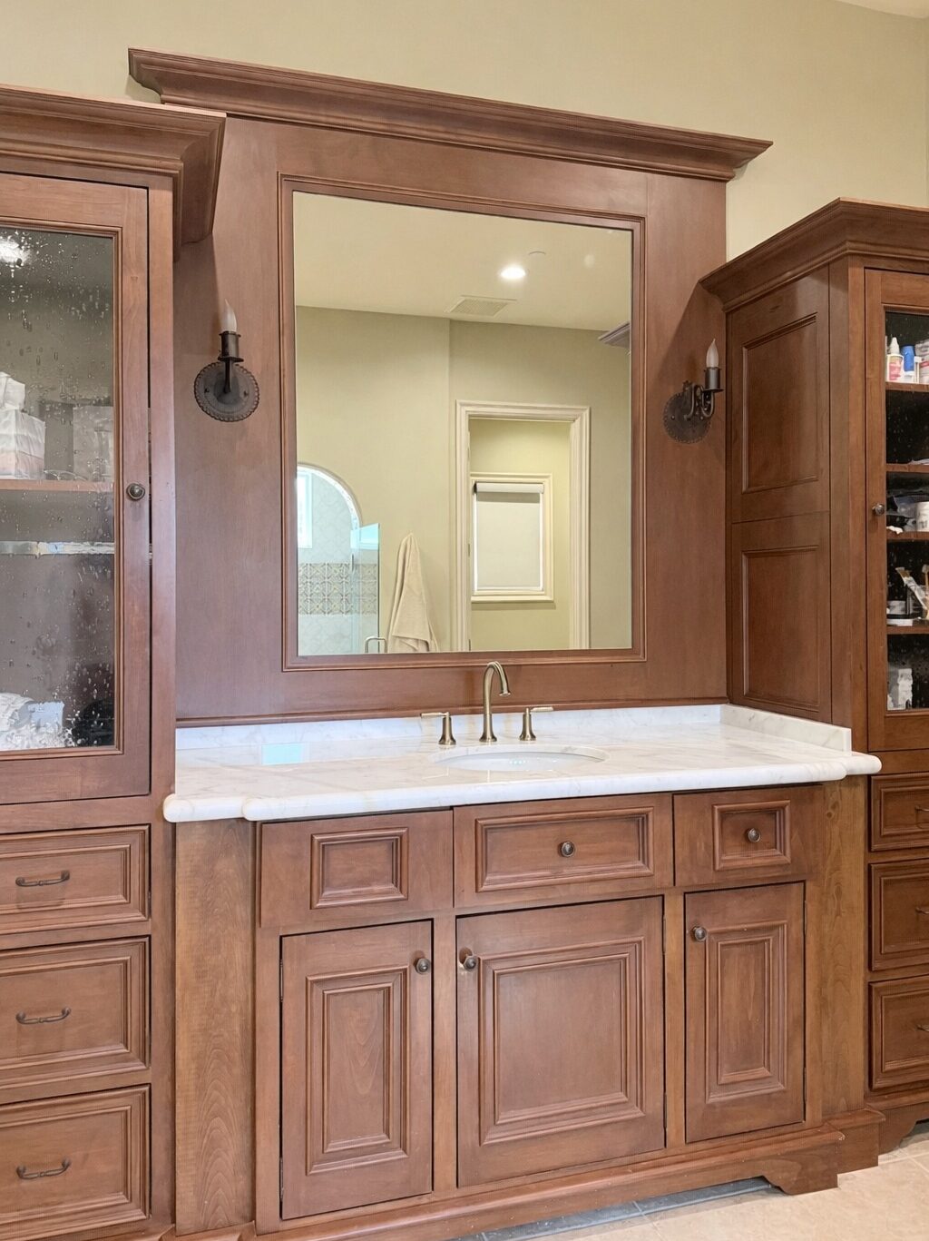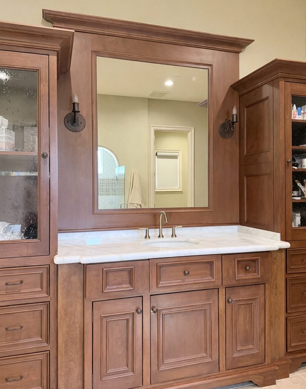 Select tile materials experienced manufacturer backorders. To maintain momentum, work was sequenced strategically—completing secondary bathroom cabinetry first and scheduling primary bath tile installation once materials were secured.