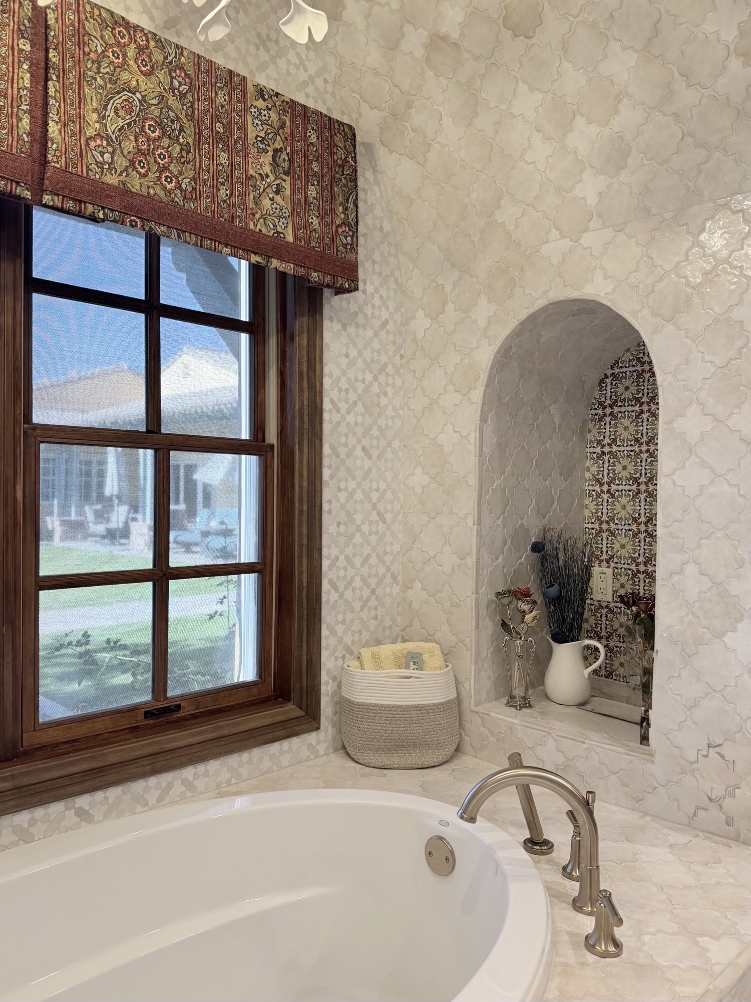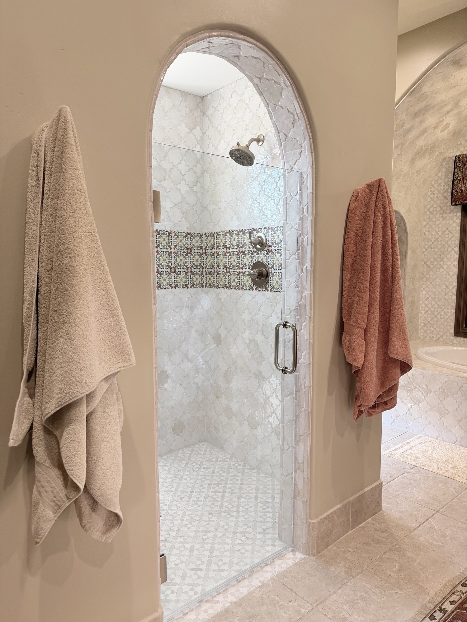 This Scottsdale home carries a warm, hacienda-inspired character with bold accent tile and layered finishes throughout. For The Equestrian Project, the focus was the primary bathroom—modernizing the shower and tub area while preserving the personality and architectural warmth of the home.