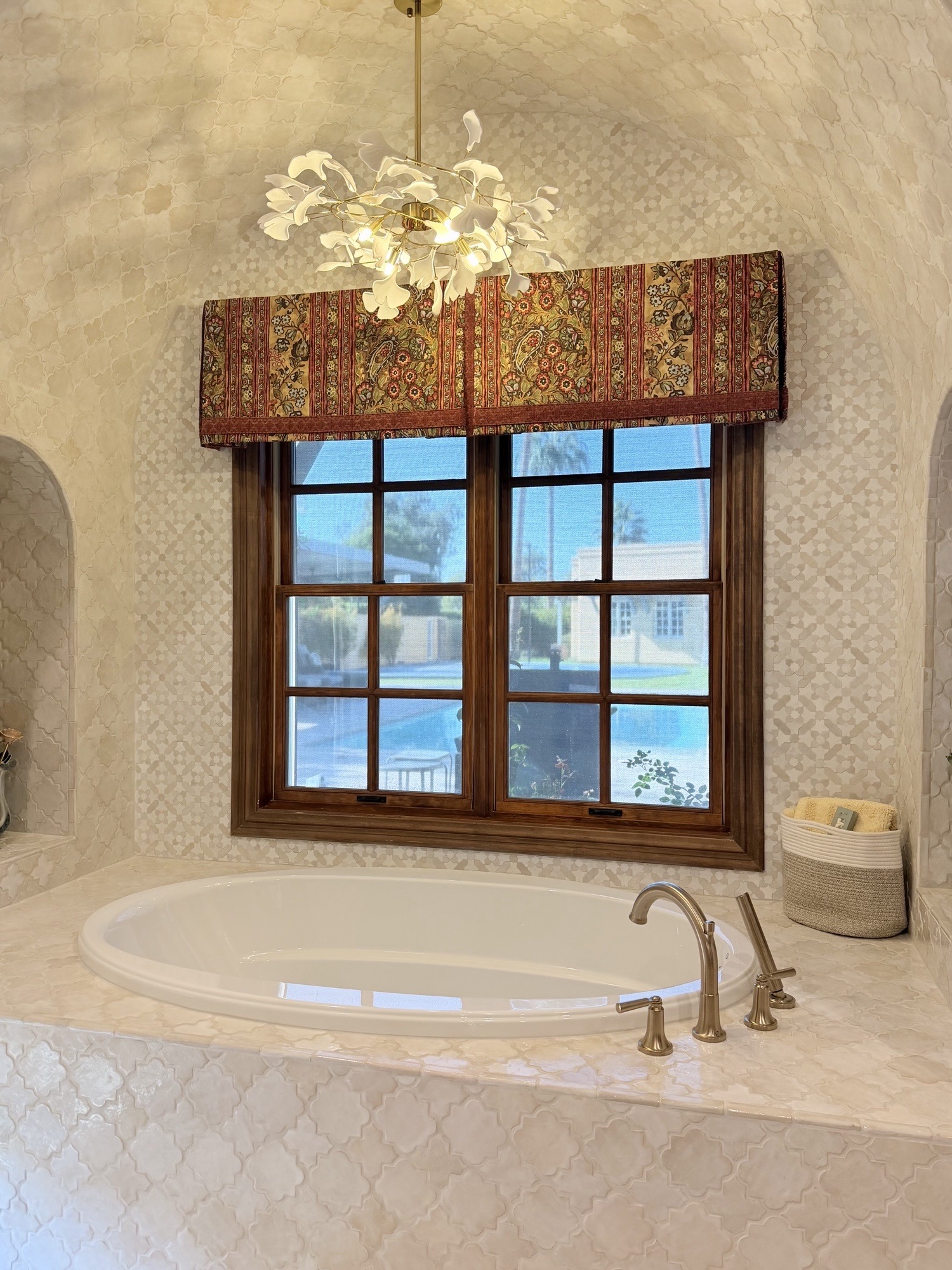The recessed can light above the tub was replaced with a decorative fixture location, adding a more architectural focal point to the space.