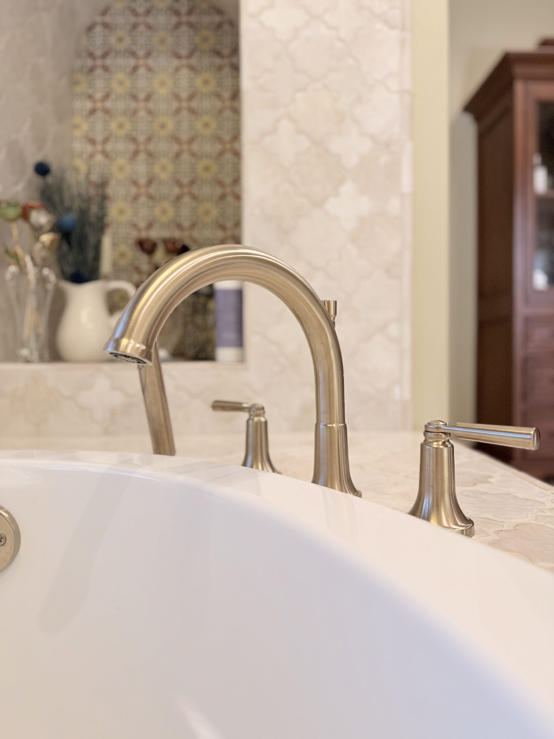 Handmade-look tile was selected to add texture and visual depth. Warm metallic finishes introduce contrast without overpowering the space. The result is a calm, elevated bathroom that feels intentional and timeless.