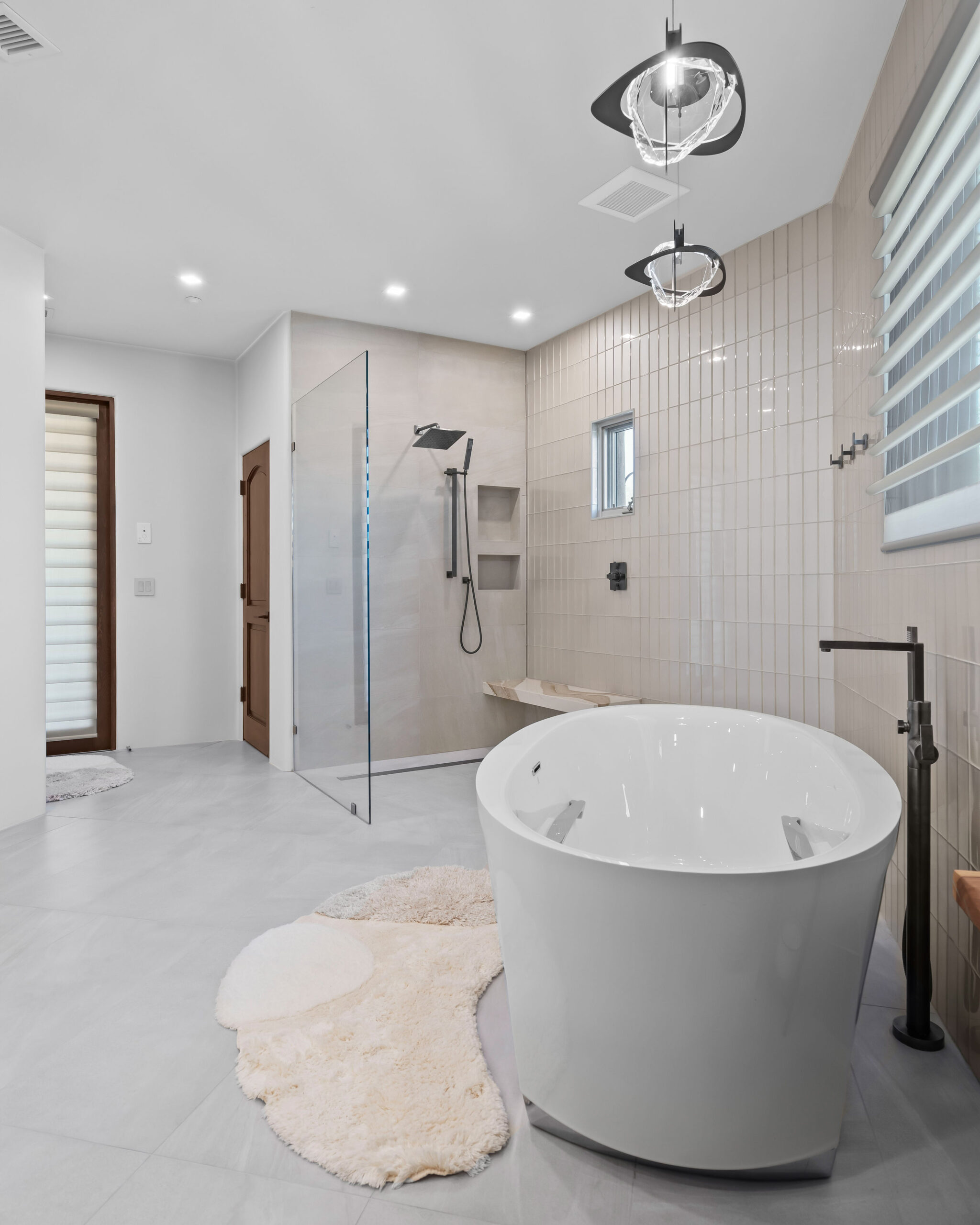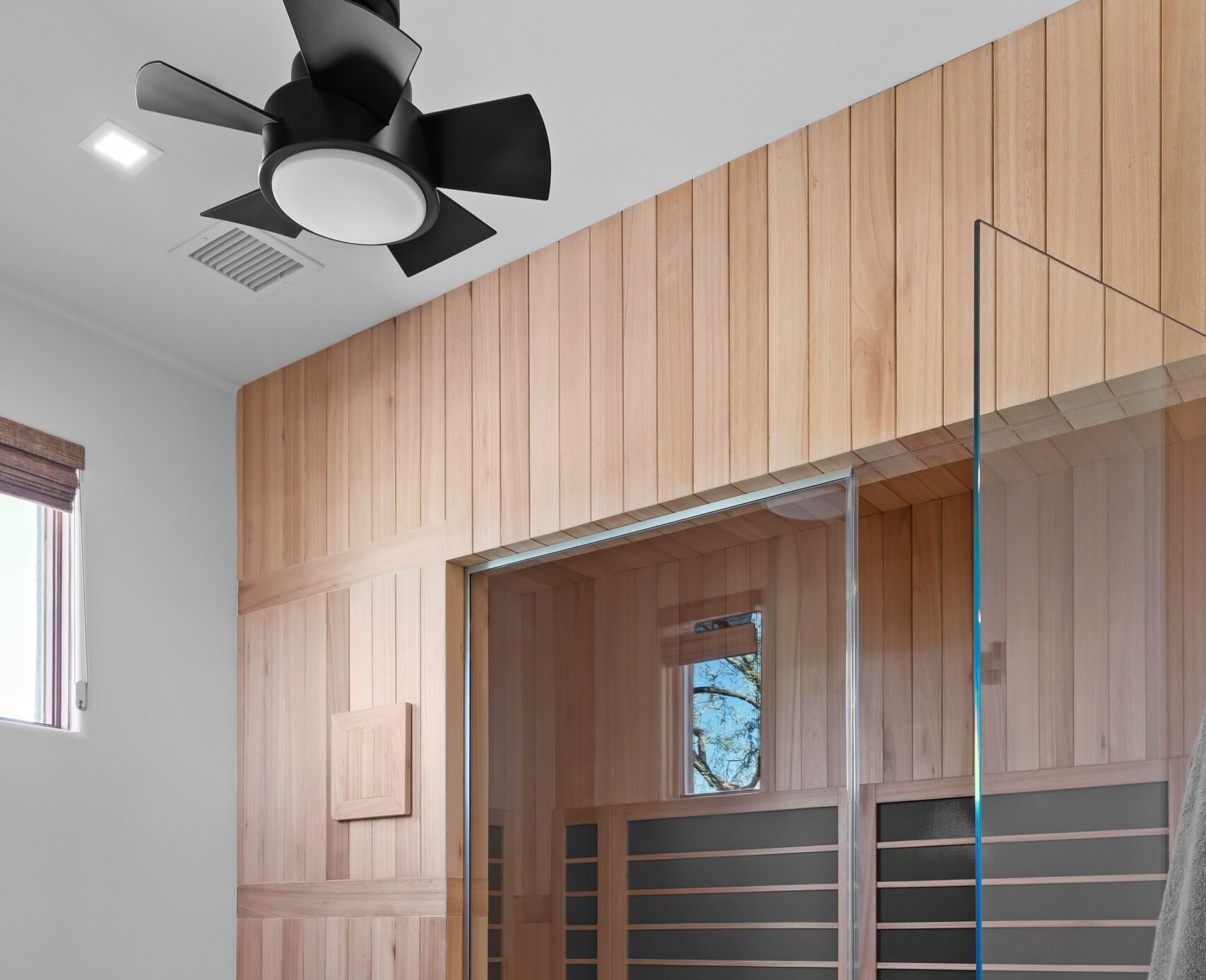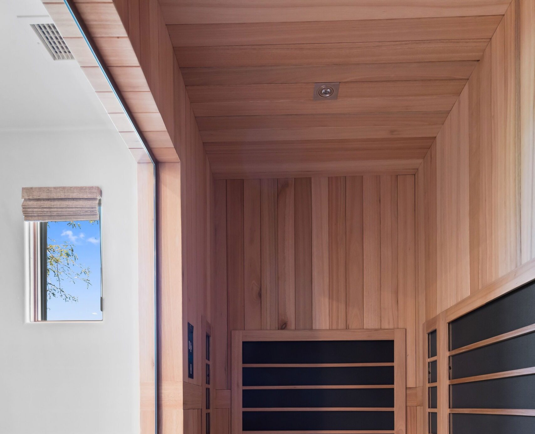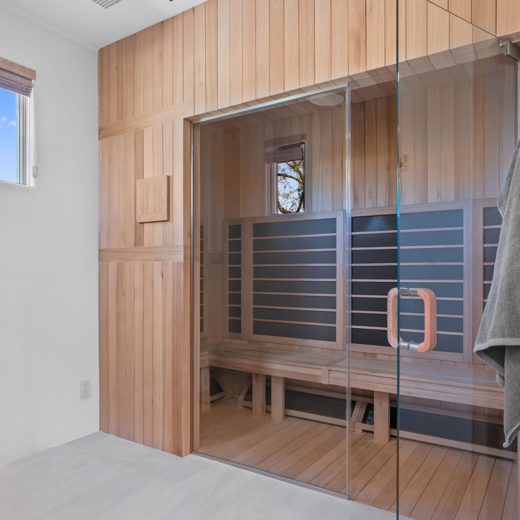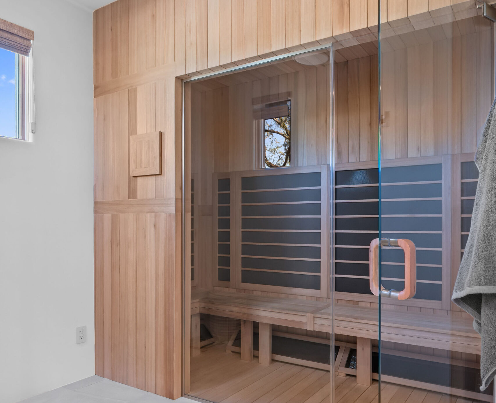 From the beginning, wellness was at the heart of the design. The color palette draws inspiration from natural desert tones — soft neutrals, warm cedar, and matte black accents that balance elegance with earthiness. Frameless glass panels maintain visual openness, while layered lighting creates both functionality and mood.