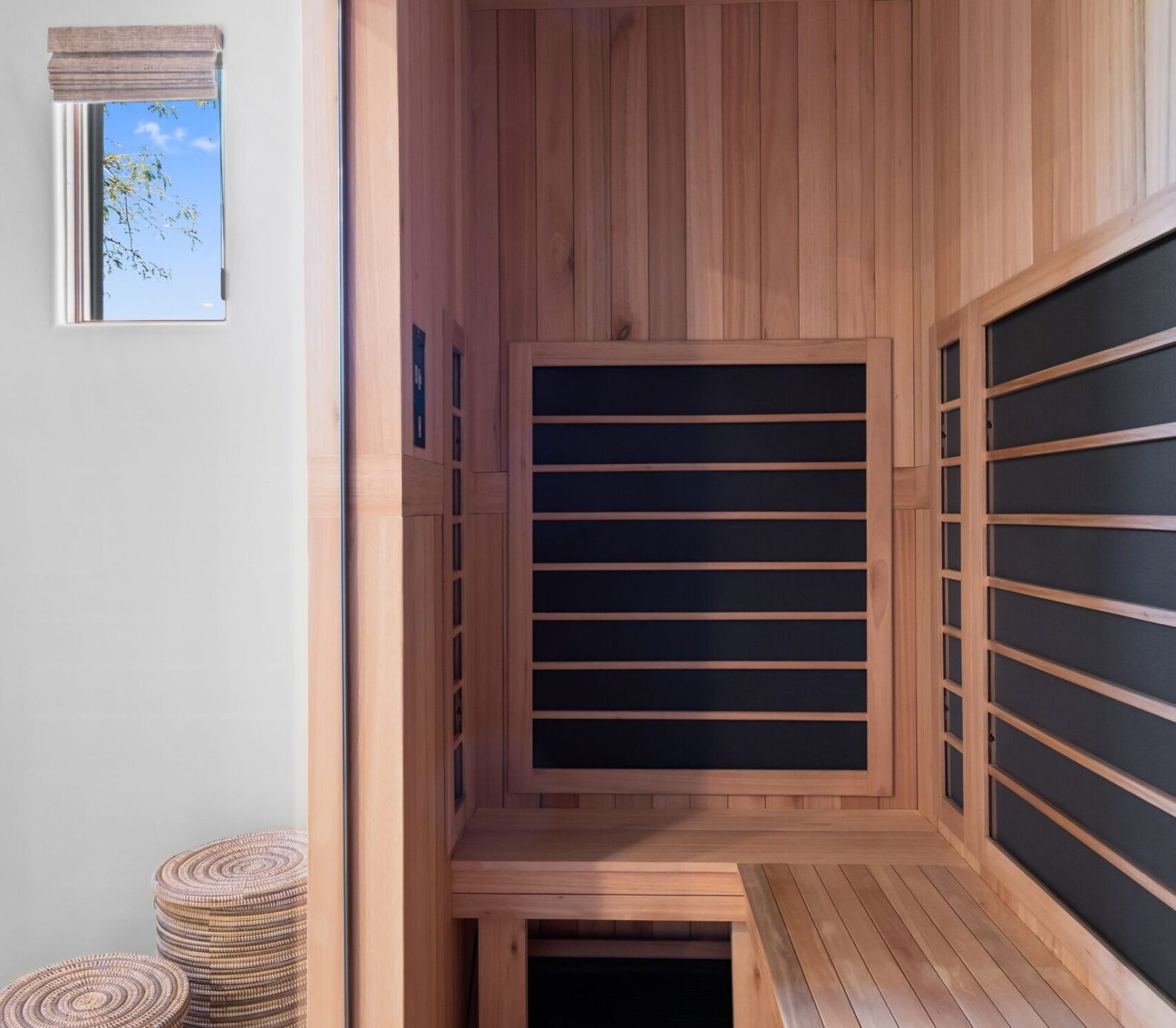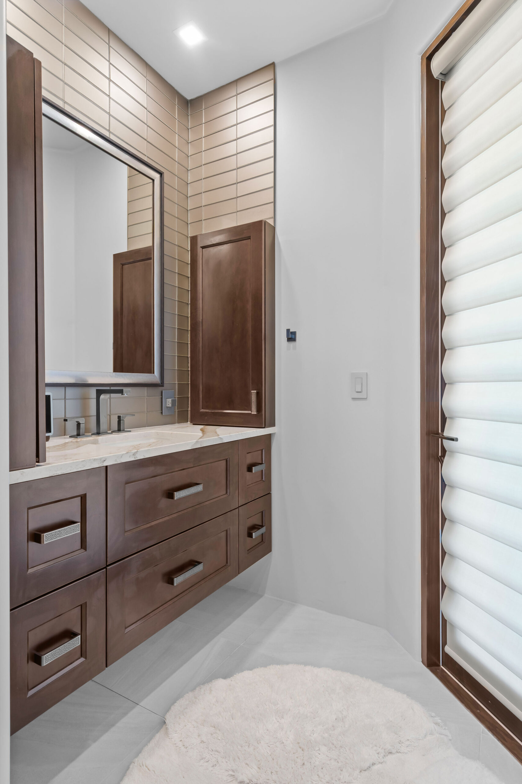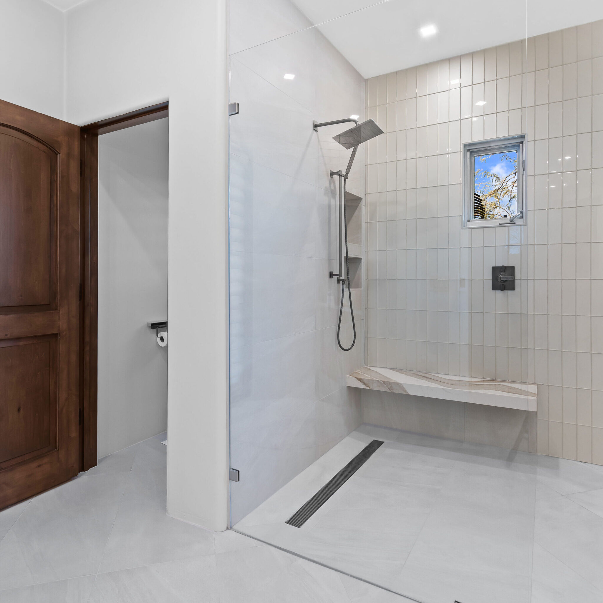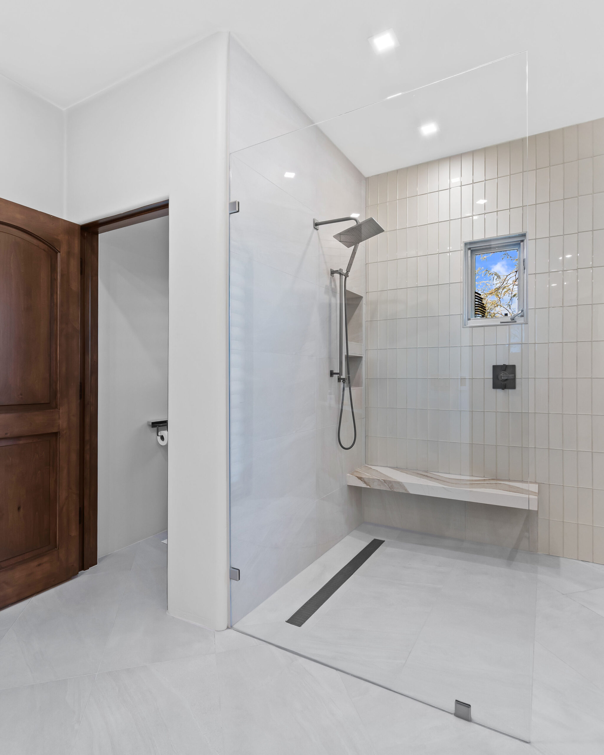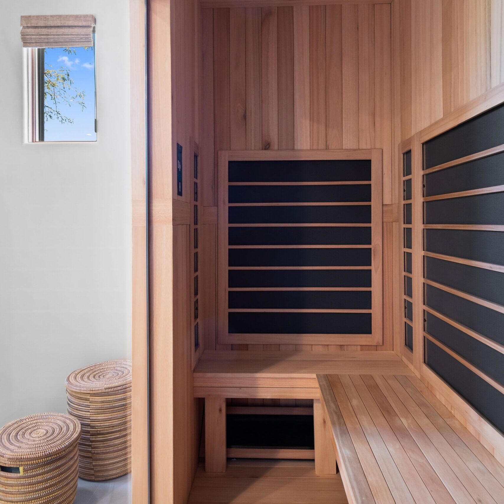 From the beginning, wellness was at the heart of the design. The color palette draws inspiration from natural desert tones — soft neutrals, warm cedar, and matte black accents that balance elegance with earthiness. Frameless glass panels maintain visual openness, while layered lighting creates both functionality and mood.
