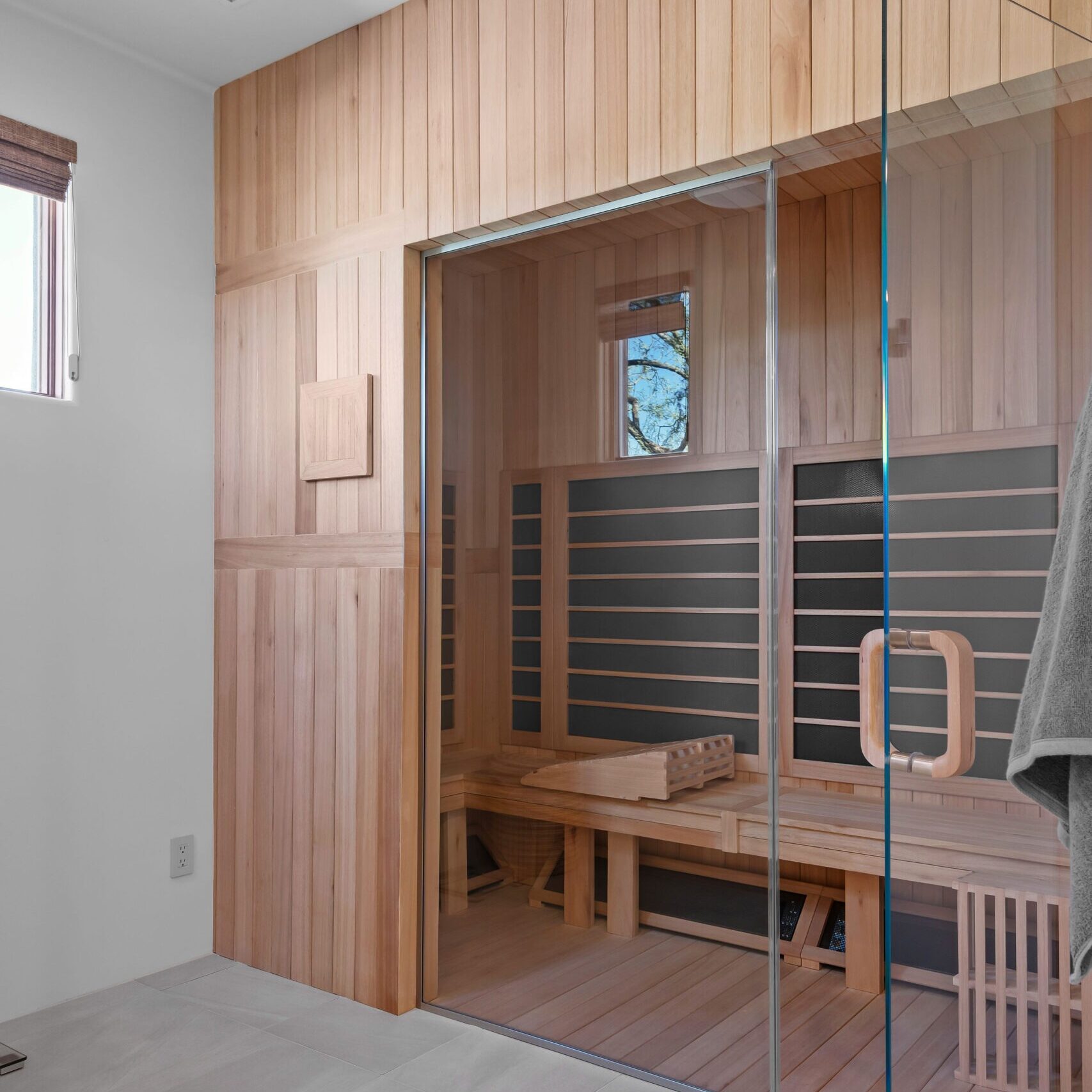 Every material and proportion was chosen to bring a sense of grounded calm to the space. Whether stepping from the shower to the sauna or soaking in the freestanding tub, the homeowners experience a smooth transition from one restorative environment to another.