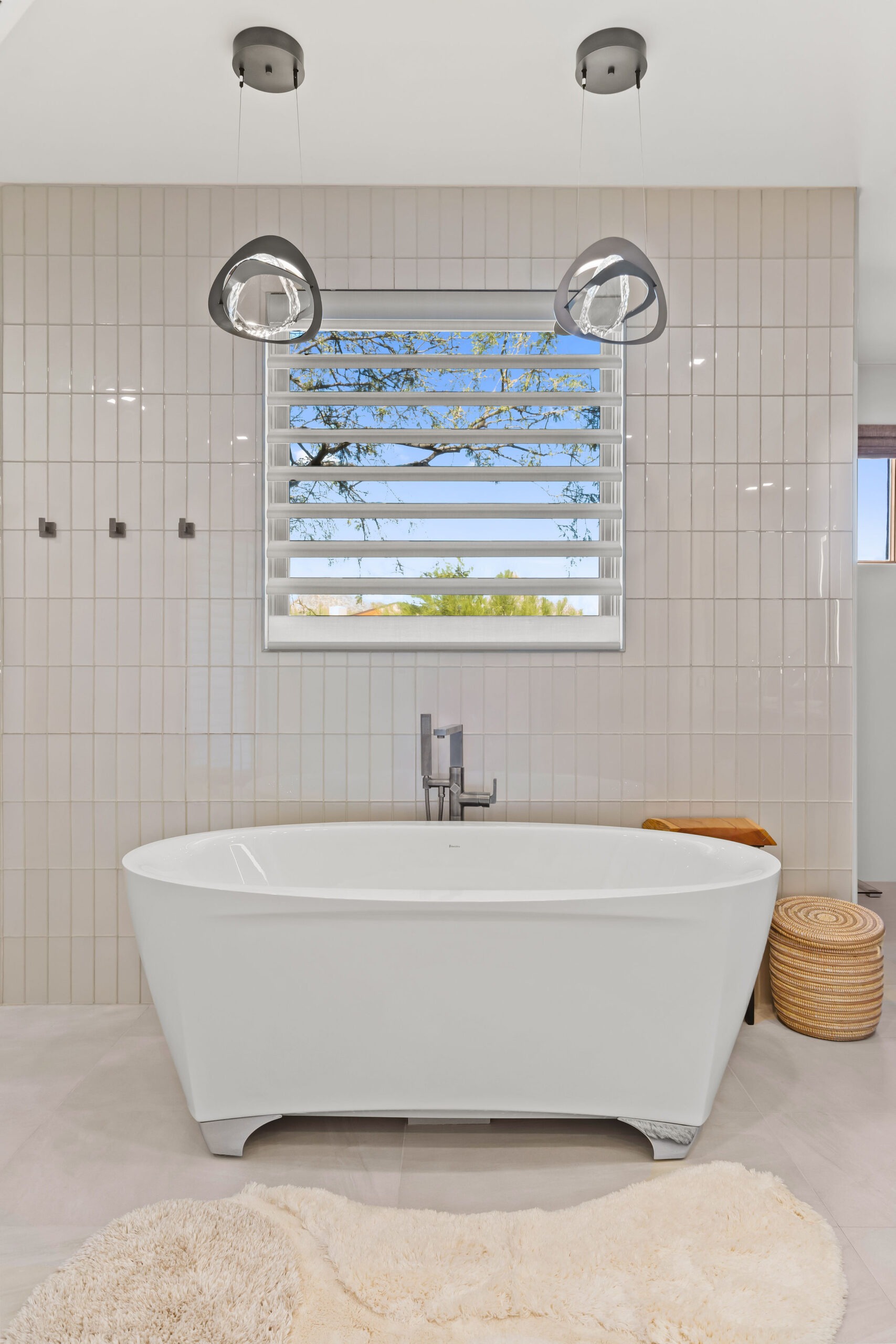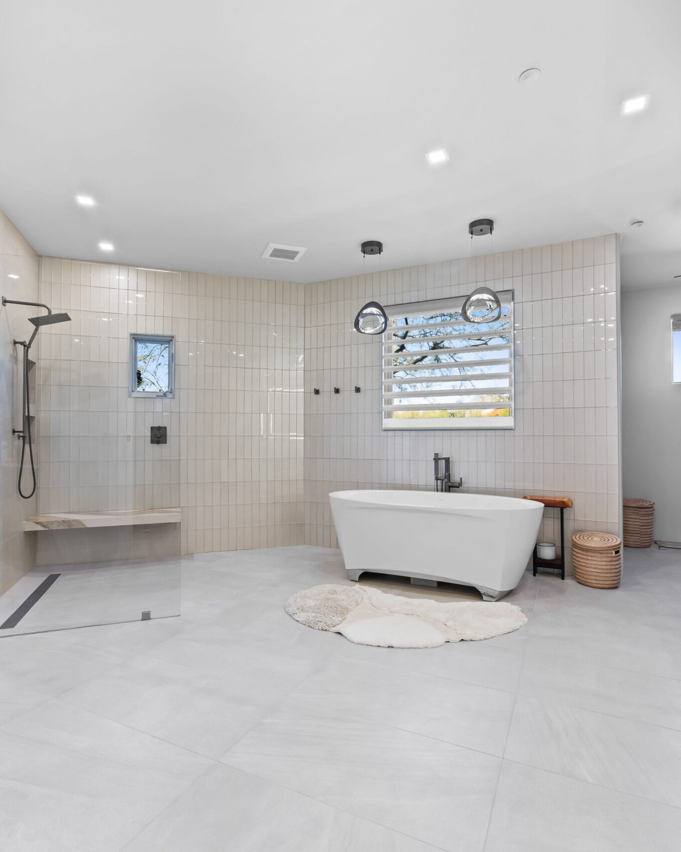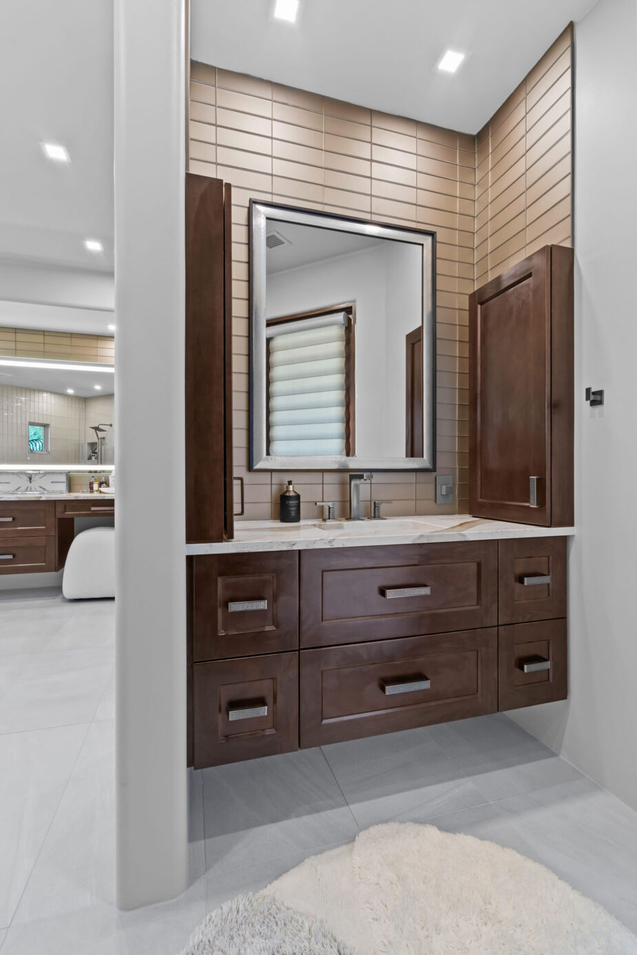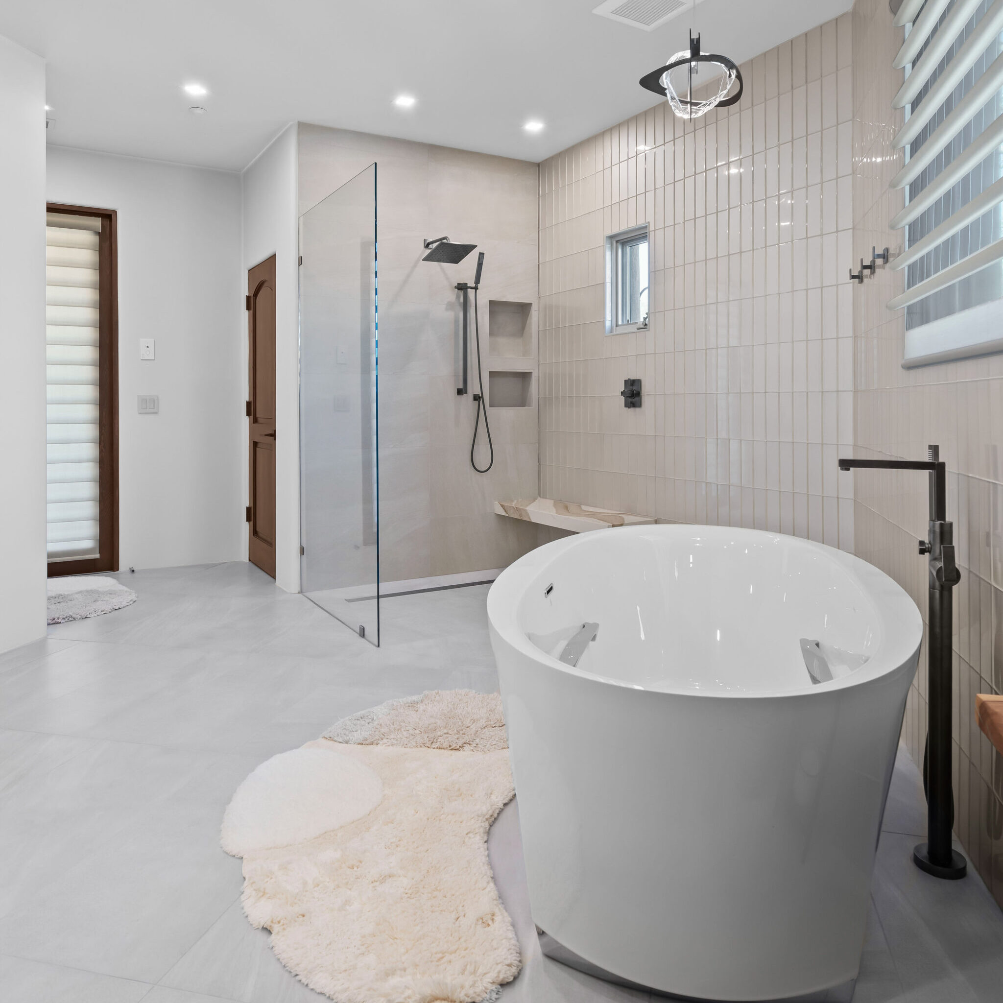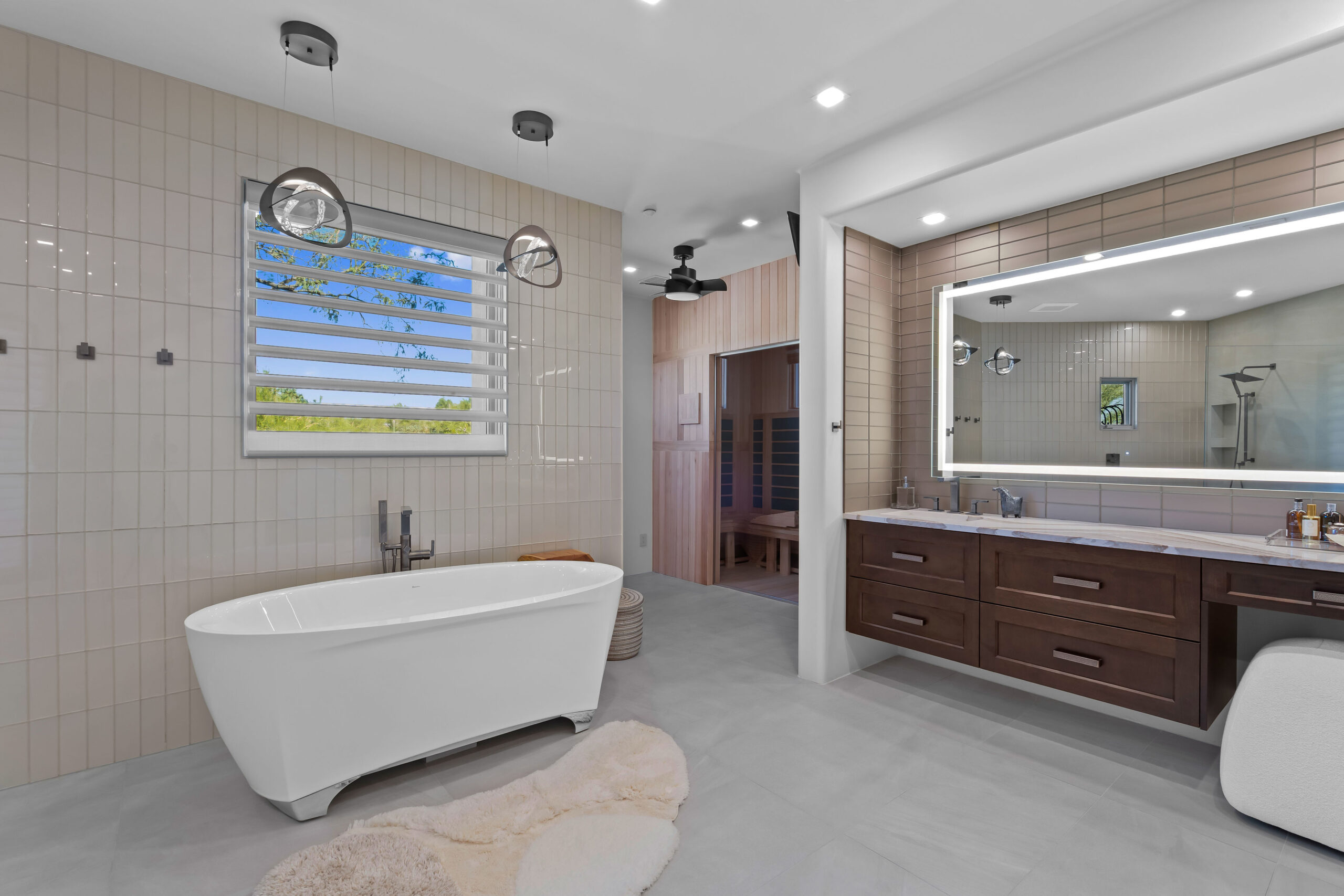 The new configuration emphasizes balance — from the symmetry of dual vanities to the connection between the freestanding tub, walk-in shower, and sauna. Every element was chosen to create a cohesive experience of movement, comfort, and calm.